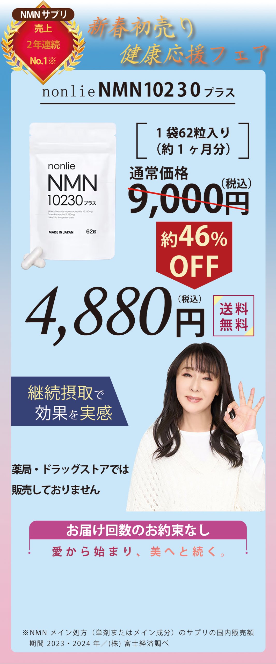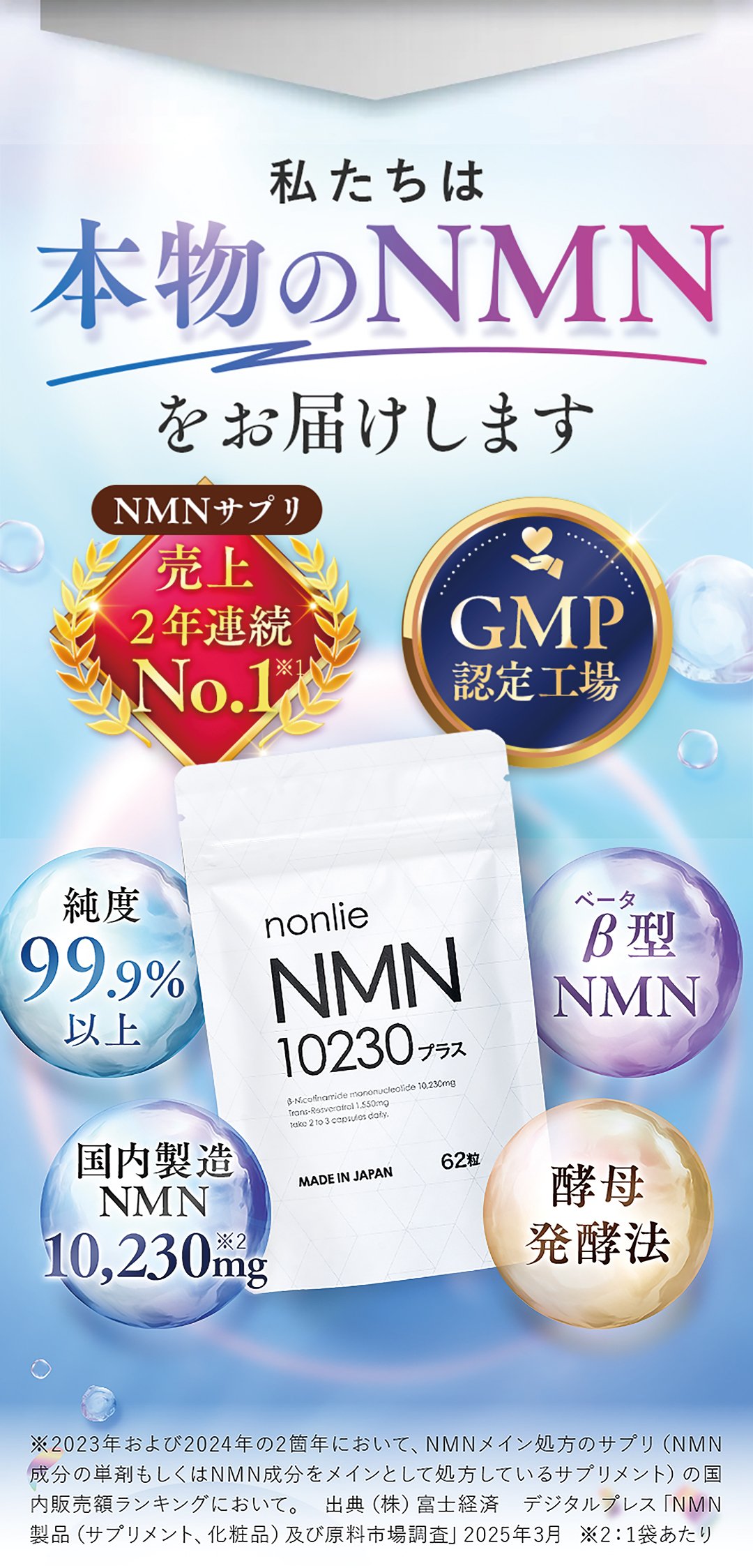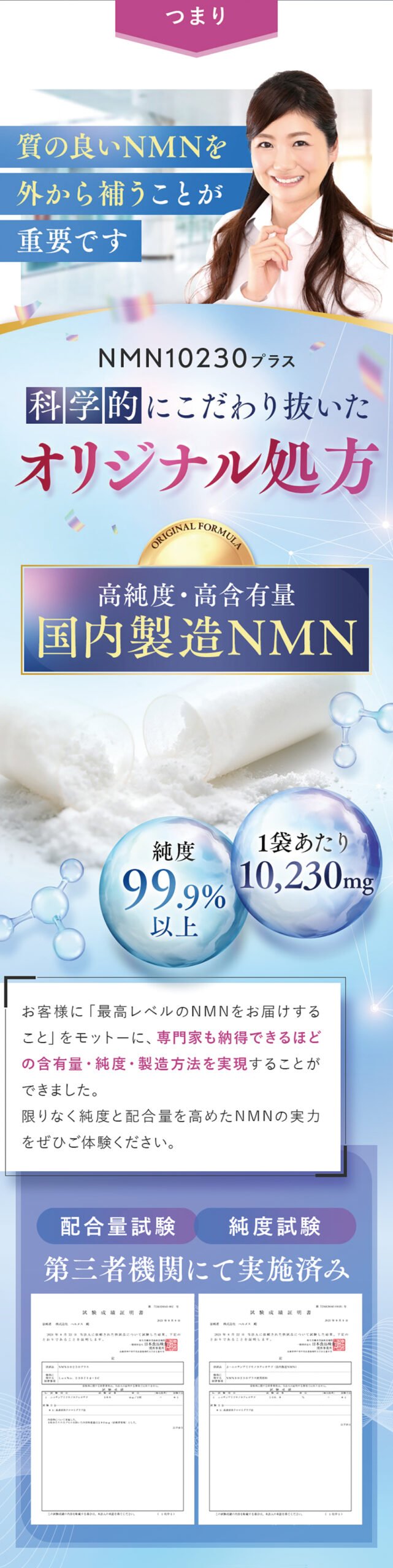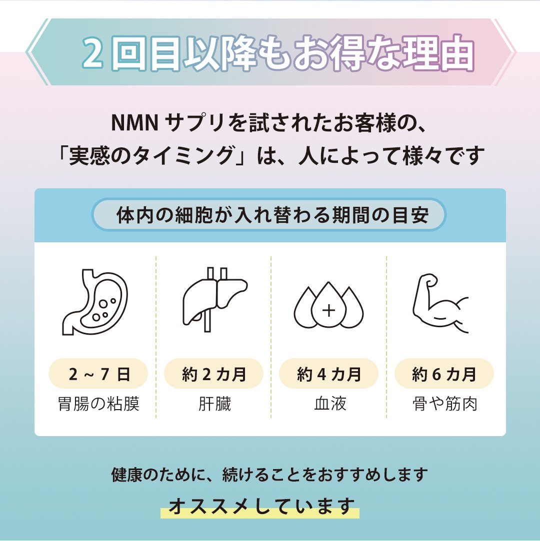 1日2~3粒を目安に、水またはぬるま湯でお召し上がりください。NMN10230プラスは補助食品なので、薬のように服用時間の決まりはありません。お客様の中には吸収効率を意識して、朝起きてすくや朝食前の空腹時に飲む方が多くいらっしャいます。