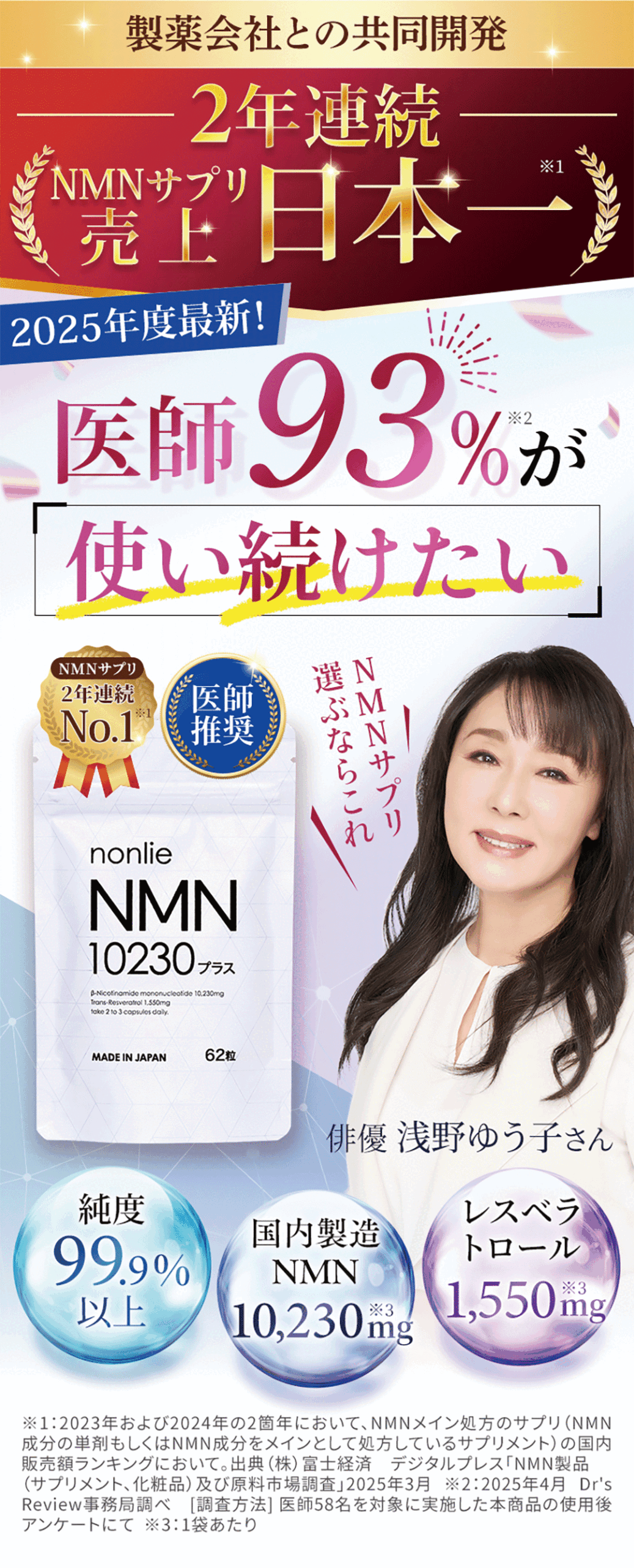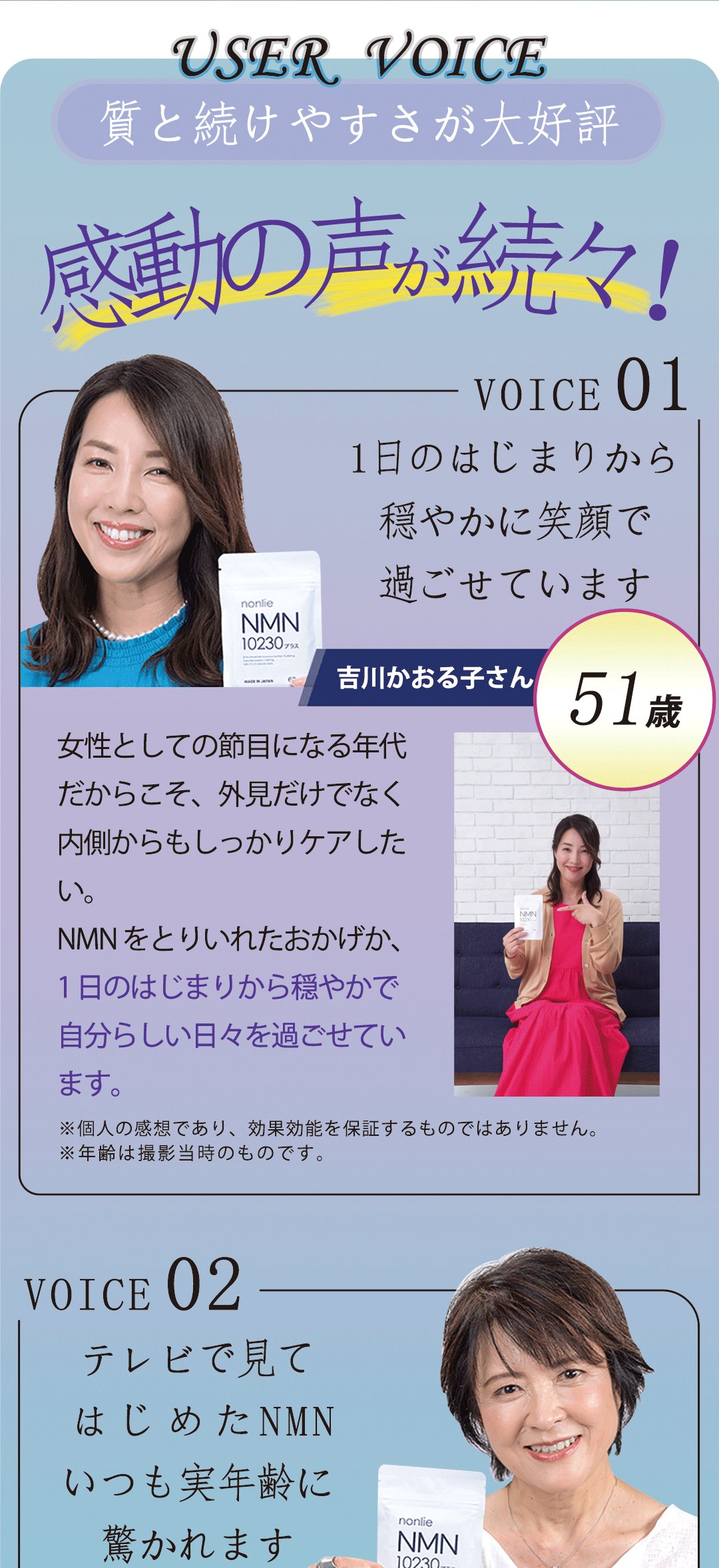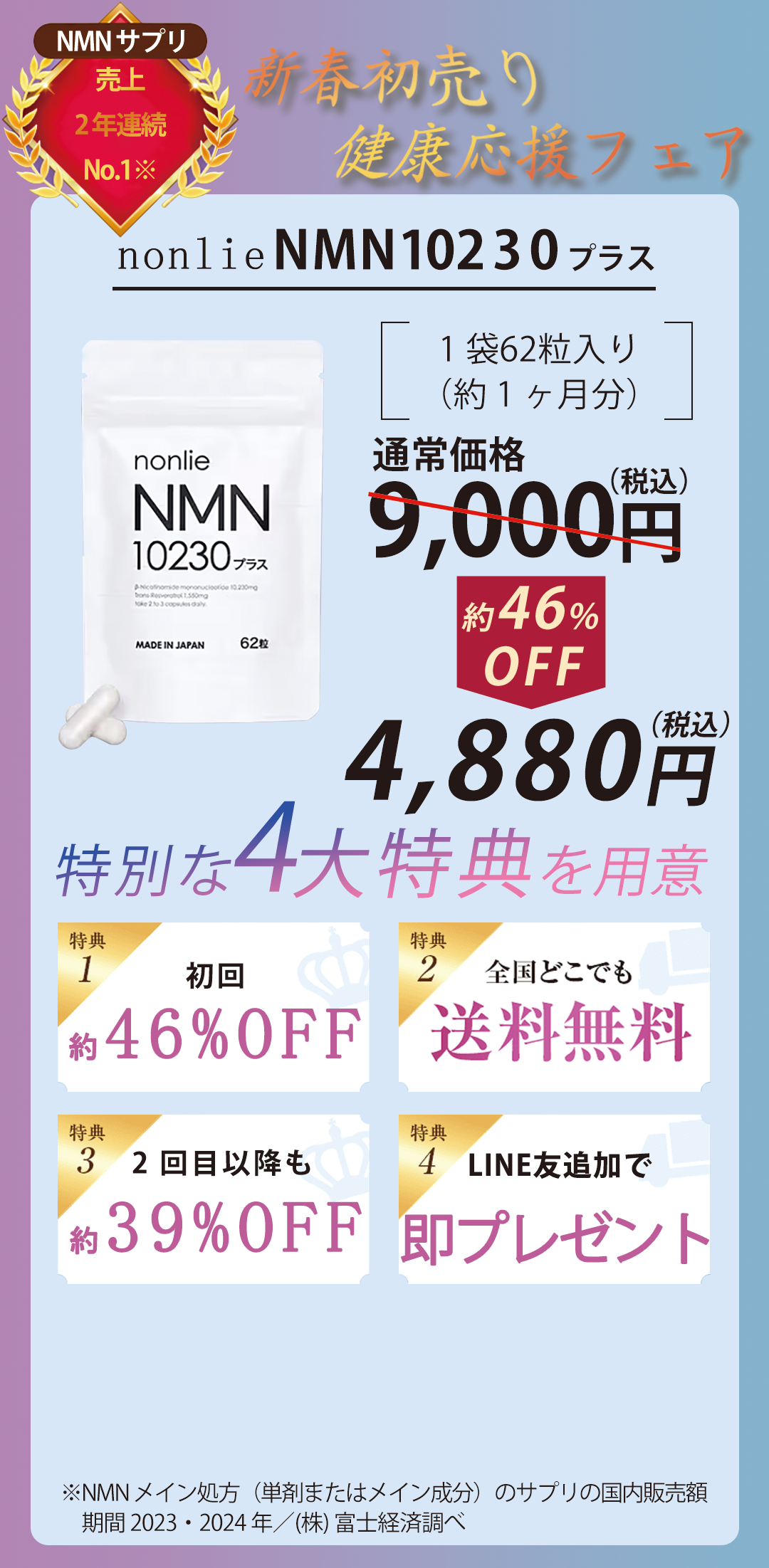 1日2~3粒を目安に、水またはぬるま湯でお召し上がりください。NMN10230プラスは補助食品なので、薬のように服用時間の決まりはありません。お客様の中には吸収効率を意識して、朝起きてすくや朝食前の空腹時に飲む方が多くいらっしャいます。