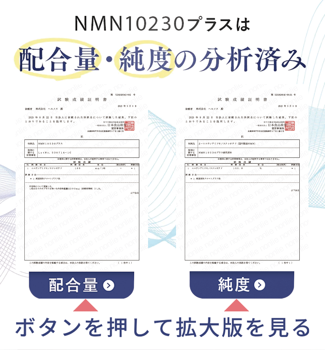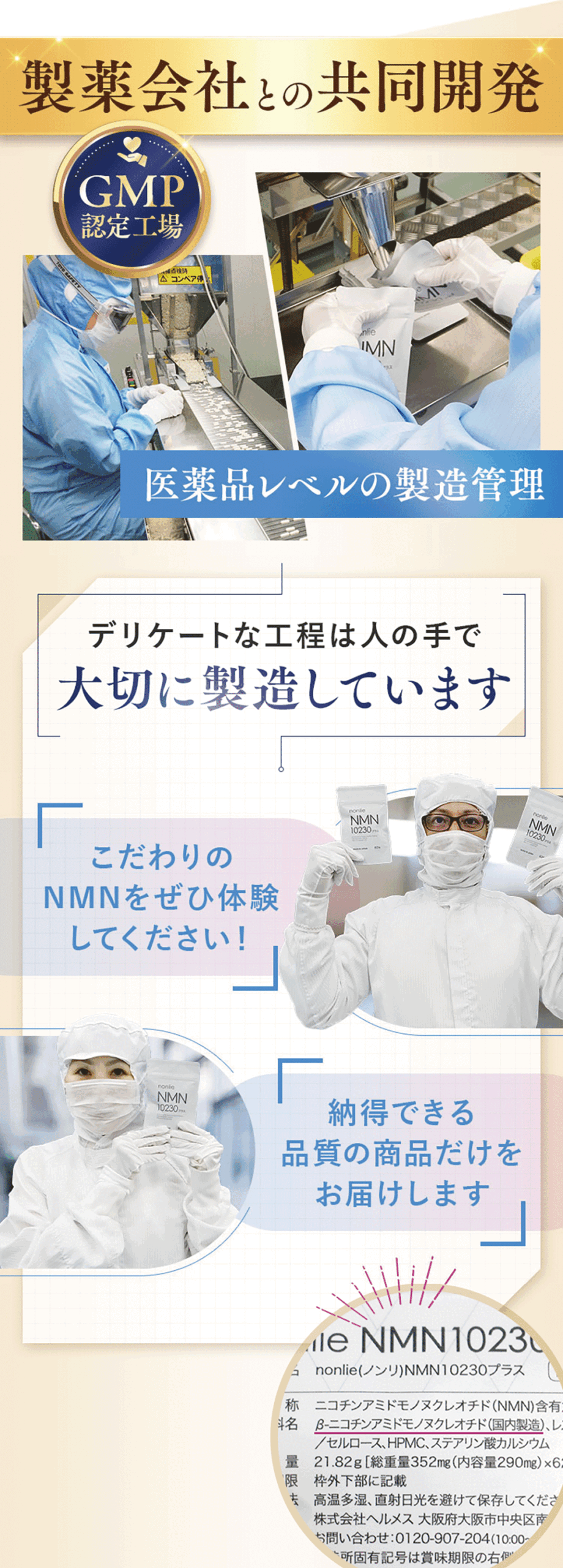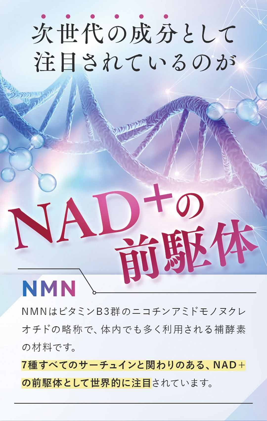 β-ニコチンアミドモノ又クレオチド(国内製造)、レスベラトロ一ルノセルロ一ス、HPMC、ステアリン酸カルシウム※原材料にアレルギ一をお持ちの方や乳幼児は、ご飲用をお控え下さい。